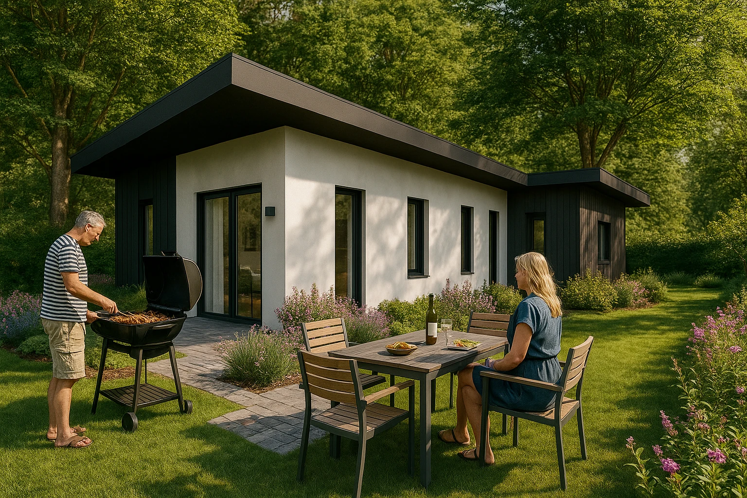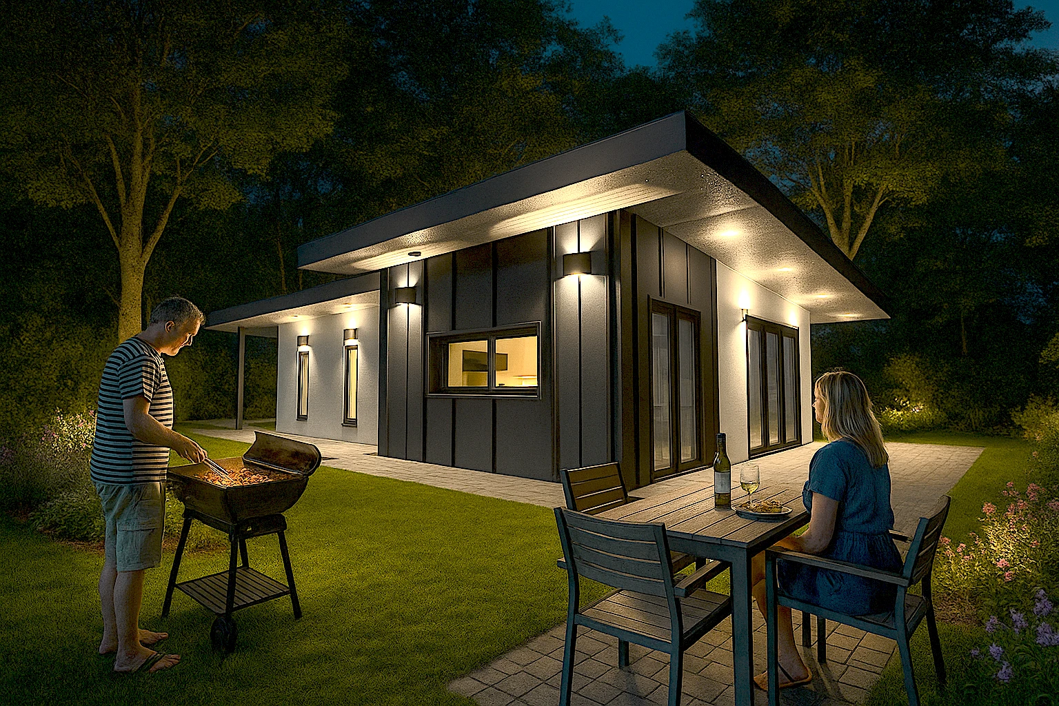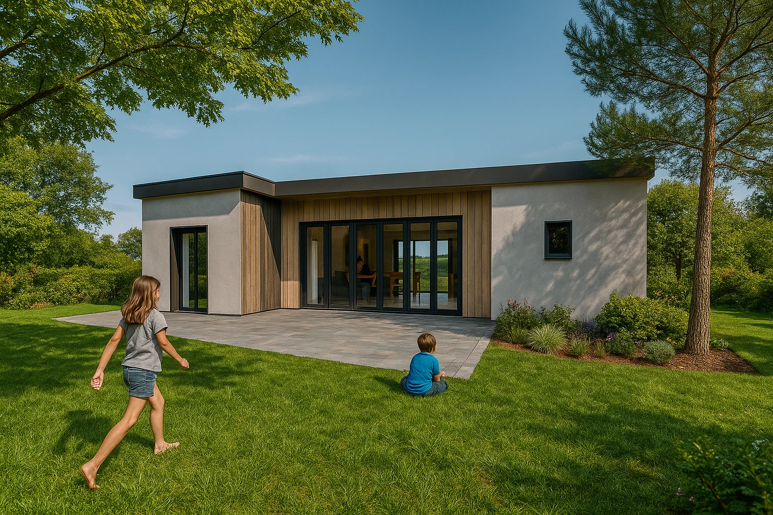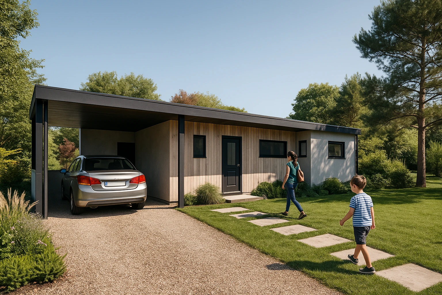 La façade de la maison associe un enduit moderne à un bardage bois naturel, créant un contraste visuel chaleureux et résolument contemporain. Ce choix de matériaux permet :