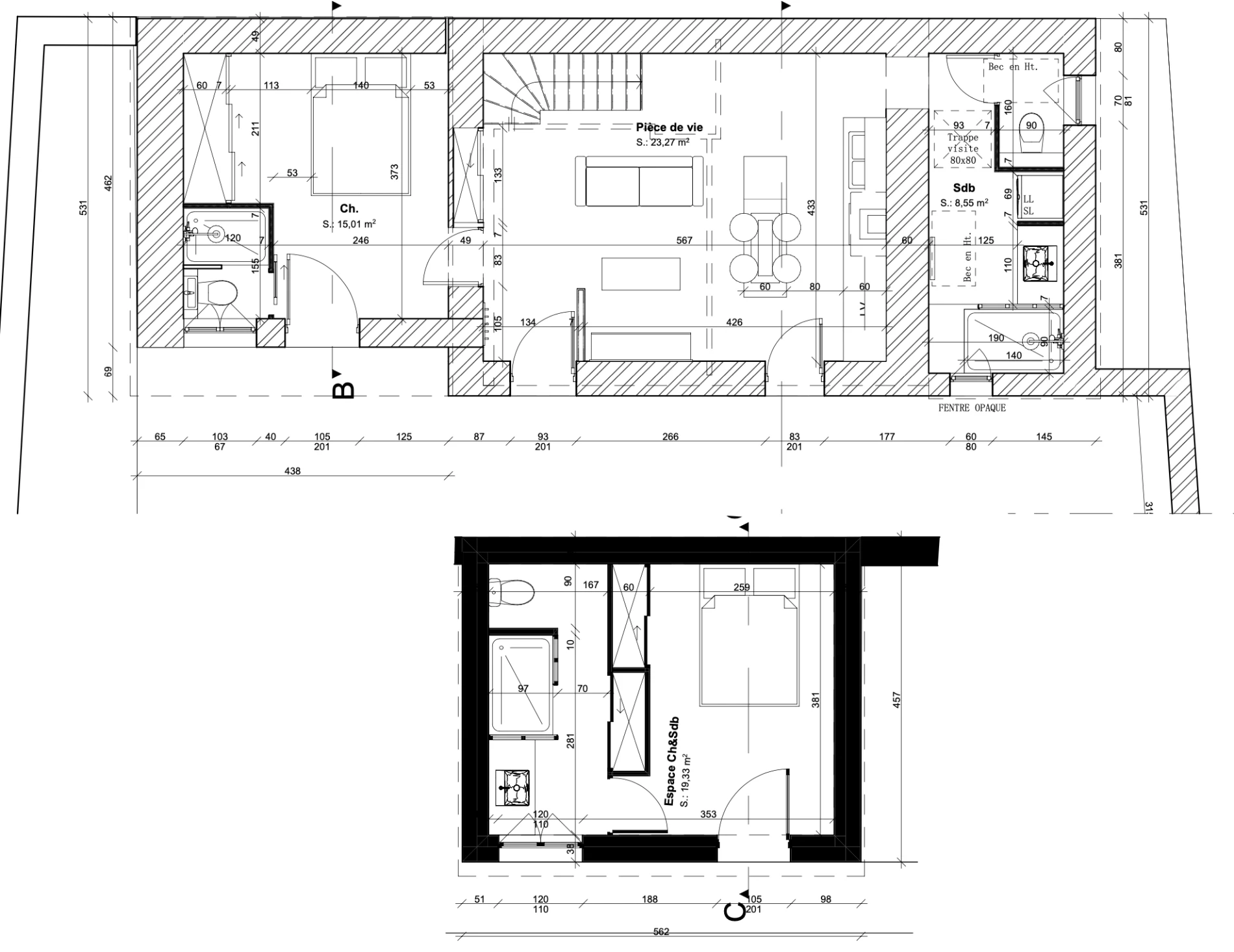 Aménagement complet du rez-de-chaussée et de l’étage afin d’optimiser chaque mètre carré.